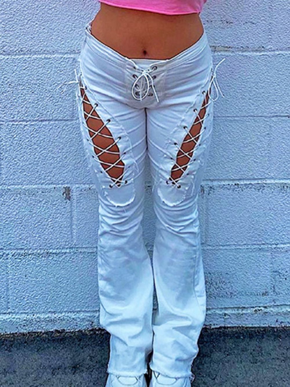 Effen Slanke Casual Broek Met Veters Over De Volledige Lengte En Middelhoge Taille