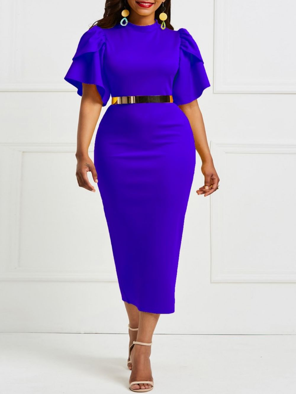 Gele Bodycon-Jurk Met Ruchemouwen En Patchwork (Zonder Tailleband)