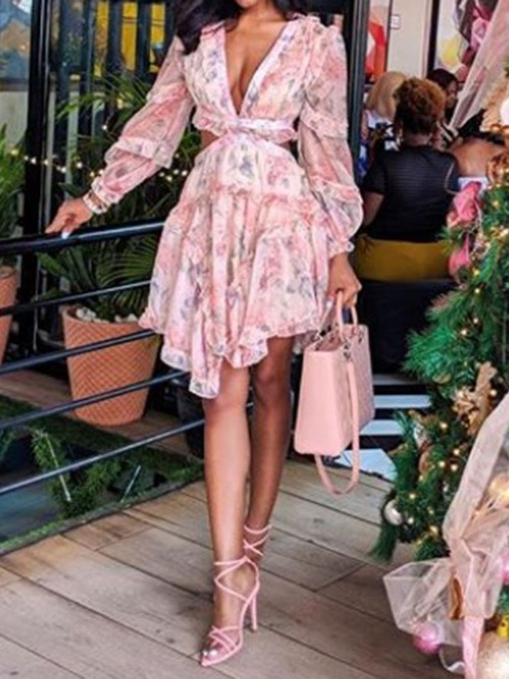 Hollow V-Hals Knielange Herfst Asymmetrische Jurk